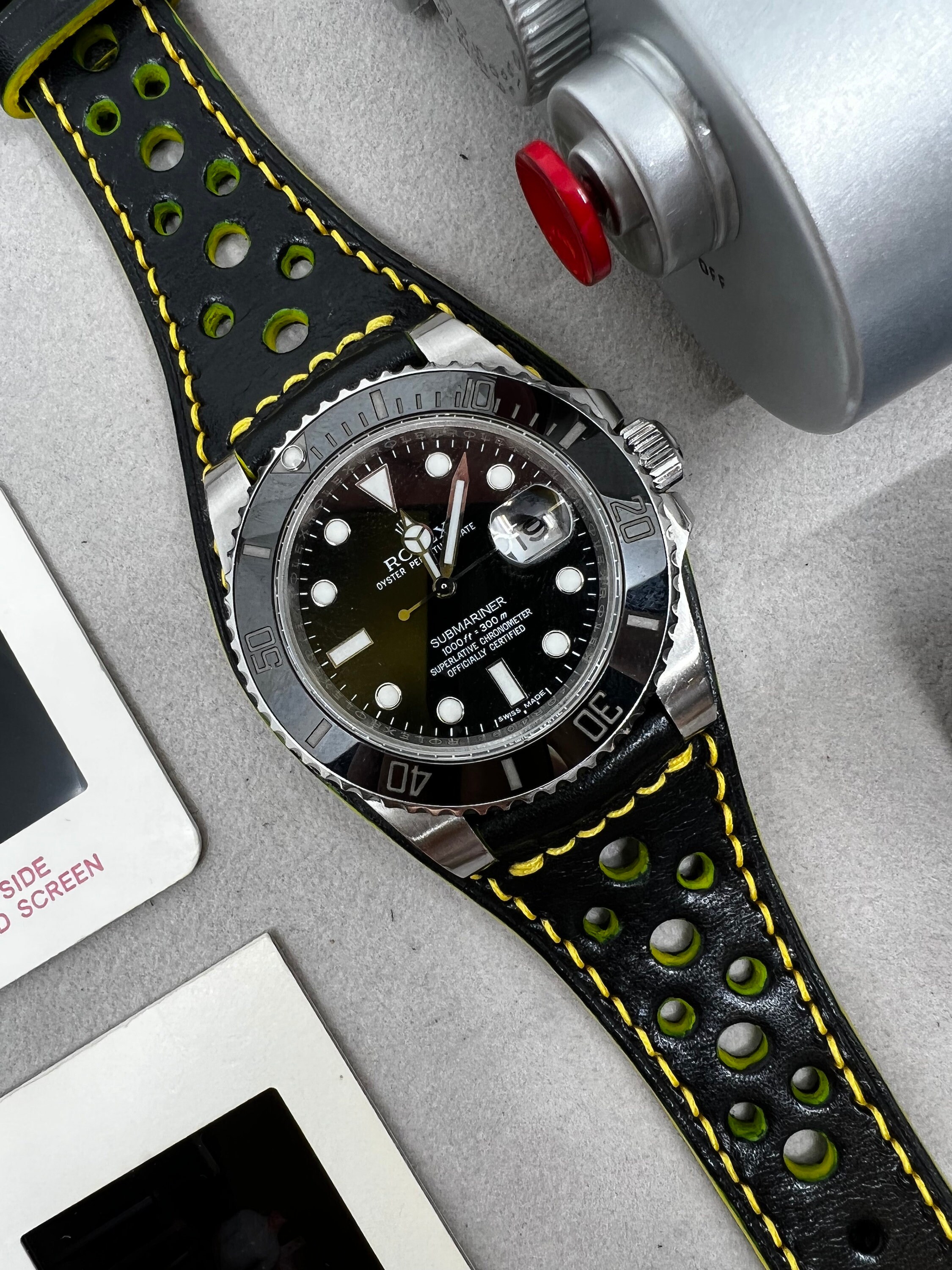 For easier reference, please see one of our listing (https://www.etsy.com/hk-en/listing/478696760) for the pure black full bund strap version. We can come with yellow color dial base or any other color you want to make your watch band more colorful.